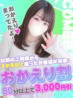 前回のご利用から三か月以上経っている方限定! おかえりの気持ちを込めて・・・ 80分コース以上は3000円オフ! 80分 12,000円⇒80分 9,000円 100分 15,000円⇒100分 12,000円 ※更にロングコースも対応可能 受付時に必ず【おかえり割】 とお伝えください(*'▽') ※ご利用は1回限りとなります。 ※本指名は適応外となります。 ※写真指名料・交通費別途 |