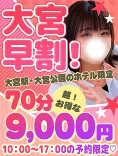 17:00までのスペシャルなイベント♪ ★70分 9,000円★ 大宮駅・大宮公園駅のホテルで お遊びのお客様限定 交通費無料&+10分サービス 60分 10,000円⇒70分 9,000円 80分 13,000円⇒90分 12,000円 100分 16,000円⇒110分 15,000円 ※上記以外のロングコースもあります。 指名料を入れても 70分 10000円ポッキリ! 超お得イベントとなっております♪ 受付時に【大宮早割】 とお伝えください(*'▽') ※ご案内17:00まで限定 ※大宮・大宮公園限定 ※本指名は適応外となります。 ※当日予約のみ適応 |