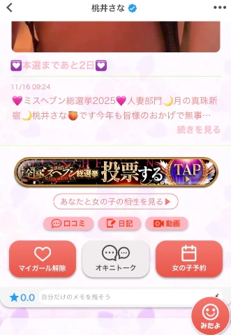 風俗情報ラブギャラリー / 東京都 / 新宿・歌舞伎町 / デリヘル / 月の真珠-新宿- / 桃井さな / 桃井さなの写メ日記一覧 / 投票の仕方おさらい