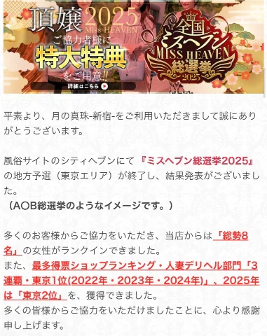 風俗情報ラブギャラリー / 東京都 / 新宿・歌舞伎町 / デリヘル / 月の真珠-新宿- / 三谷まいか / 三谷まいかの写メ日記一覧 / ♥️10,000ポイントGET♥️