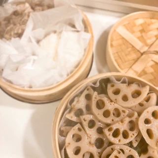 豚コマ、冷凍ごはん、卵、小松菜、レンコンを一度にせいろ蒸しでホカホカ