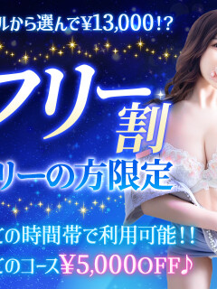 ★━━━━━━━━━━ 『フリー割』 ━━━━━━━━━━★ 直接ご来店のお客様限定 『フリー限定』割引イベント開催中‼️ パネルから女の子が選べて総額13,000円! 5,000円OFFでご案内致します。 ・全ての時間帯 ・全てのコース が対象の特別イベントでございます! ※注意点がいくつかございますので、必ず最後までお読みくださいませ。 ※ご予約不可(本指名不可) ※口コミの投稿をお願いしております。 ※対象外のキャストあり ※17時以降は遅番料金となります。 ※告知無き場合はイベント対象外とさせて頂きます。 ご予約のお電話 052-959-4777 皆様からのお電話、心よりお待ちしております。 当店はアルバム見学無料でございますのでお気軽にお越しいただきまして、お好みの女性をお探しくださいませ ━貴方のステータス━ 『心躍る程の感動的な出逢い…』 |