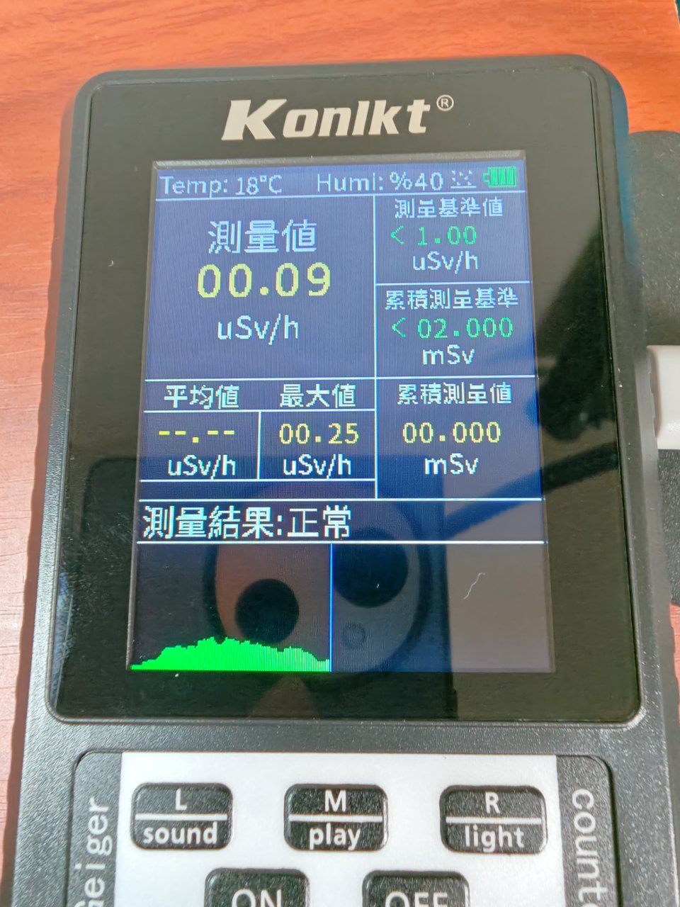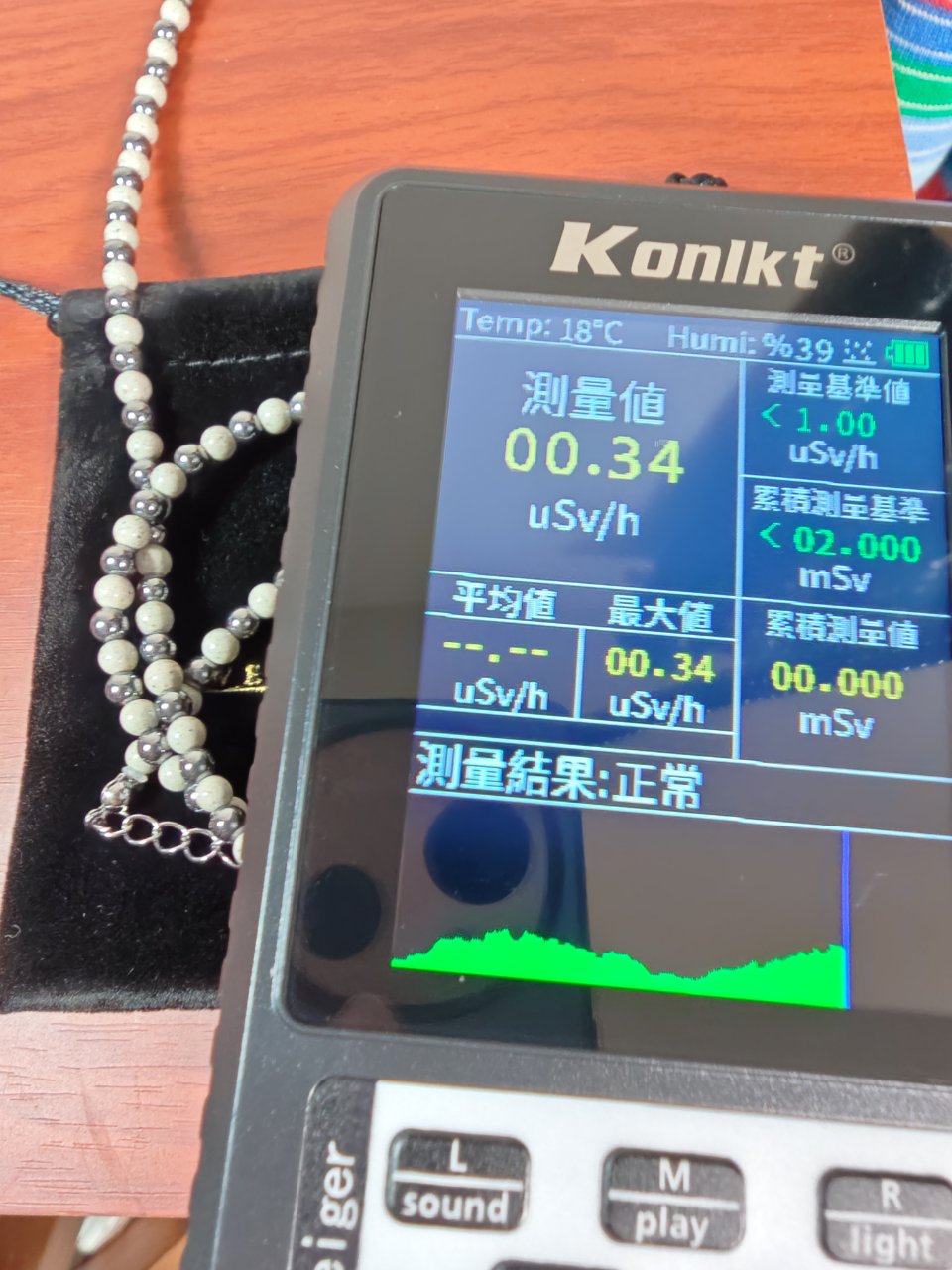 で、北投石からは微量の放射能が出ているためガイガーカウンターが反応するってことだったのでなんとわざわざガイガーカウンターまで買ってやってみた結果↓