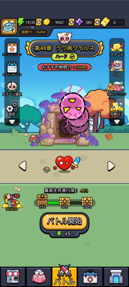 ひたすらセルサバイバーやってるフランです♪ディスガイアRPGもちょびちょびやってるけど、セルサバイバーの方が最近やってる時間が長い気がする♪きっと広告見てる時間が長いからだと思う・・・♪早く第50章行きたいのにうつ病ウイルスで少し苦戦してる♪武器は『毛一本』『大型メス』が好きかな♪