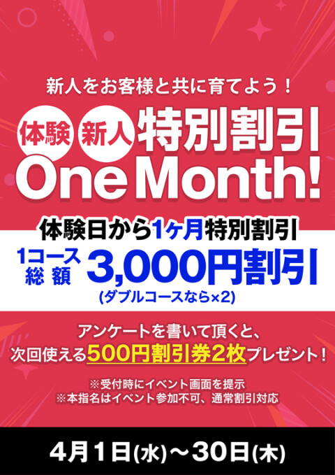 新人をお客様と共に育てよう! 体験日から1ヶ月特別割引 1コース総額:3,000円割引(ダブルコースなら×2) アンケートを書いて頂くと、次回使える500円割引券2枚プレゼント! ※受付時にイベント画面を提示 ※本指名はイベント参加不可、通常割引対応 |