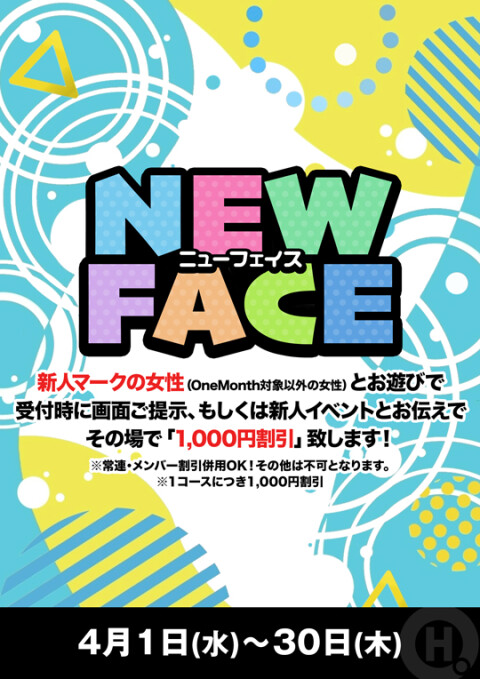 新人マークの女性(OneMonth対象以外の女性)とお遊びで「次回使える割引券」1枚プレゼント!本指名もOK! ※常連・メンバー割引併用OK!その他は不可となります。 ※「One month!」との併用は不可 |