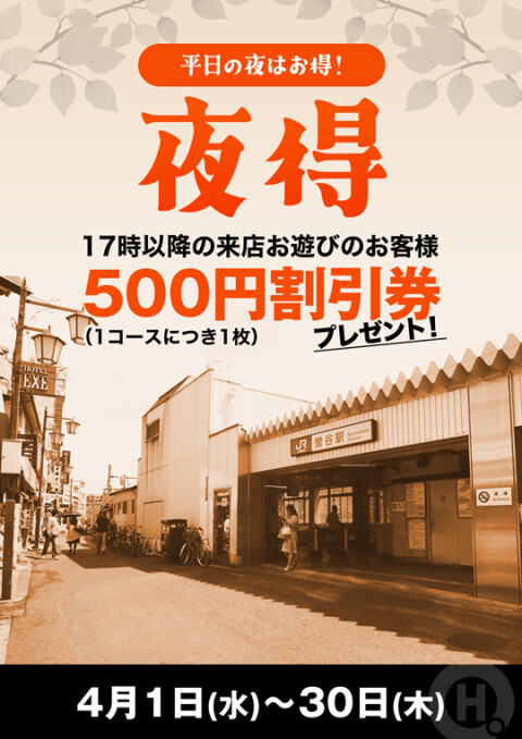 17時以降の来店お遊びのお客様500円割引券プレゼント! (1コースにつき1枚) |