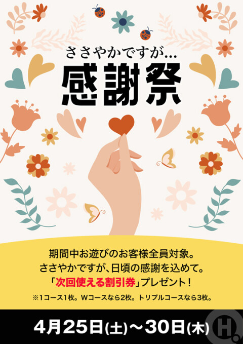 開催日:4月25日(土)〜30日(木) 期間中お遊びのお客様全員対象。 ささやかですが、日頃の感謝を込めて。 「次回使える割引券」プレゼント! ※1コース1枚。Wコースなら2枚。トリプルコースなら3枚。 |